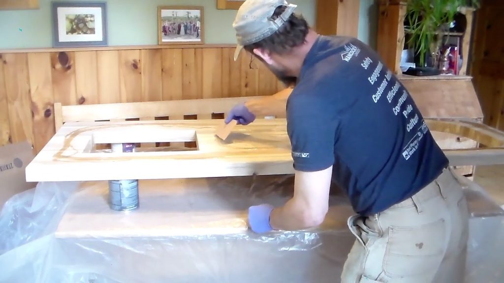 I poured the mixed epoxy on the top of the butcher block countertop and used a plastic spreader to scrape the epoxy evenly around the surface. I found the edges tricky because the epoxy kept succumbing to gravity and dripping onto the table. It wasn’t terrible, I had a sheet of poly to protect the table, but I wanted that epoxy to stay on the countertop!