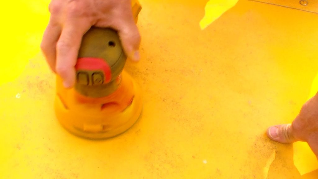 So, using 80 grit pads on my Milwaukee Orbital Sander, I sanded my way down the roof of the bus. I tried to get as much grit, grime and whatever was stuck to the roof off without sanding into the primer coat. Mostly, I wanted to sand off the sheen.