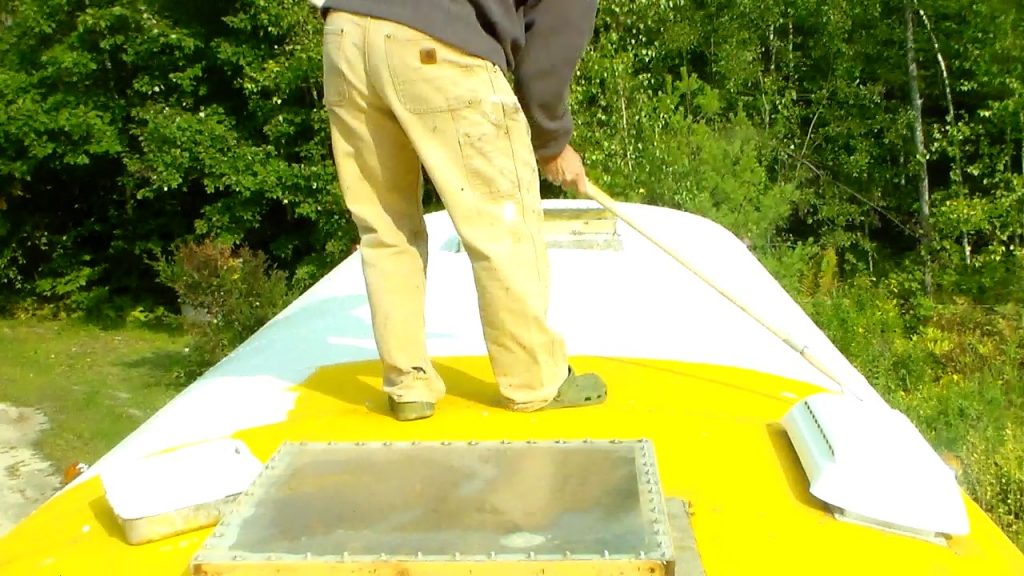 I used a 3/4″ nap, 9″ wide roller mounted on a broom handle to roll on the first coat on going across the roof of the bus. It took me 35 minutes.