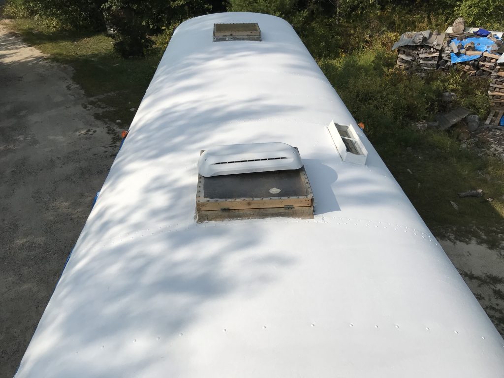 My bus roof is about 27 feet by 7 and a half feet. After two coats I still had over half of my five gallon bucket left and it looked like the roof could use another coat. In talking with other Skoolie owners who have used Henry’s Dura-brite, they, too, said that three coats did the trick. So I added another coat, going across the grain again. And I still have just a little less than half a bucket left.